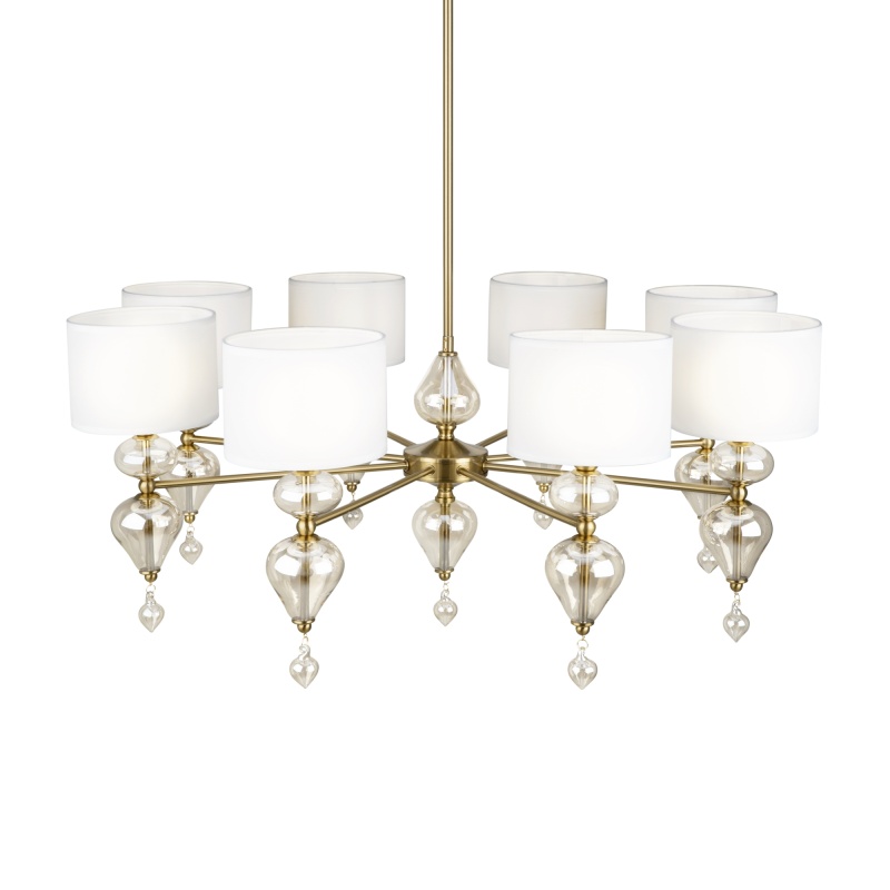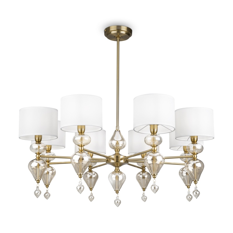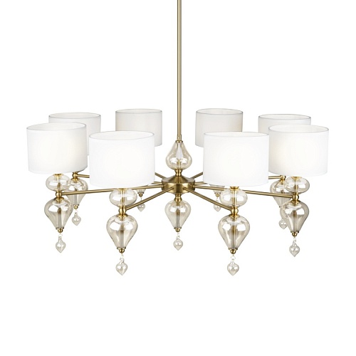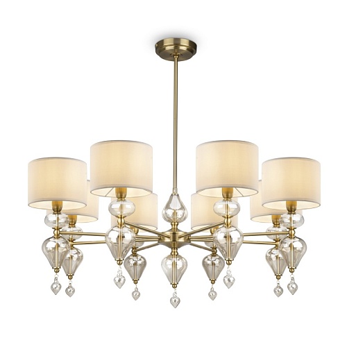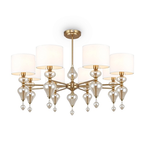 Арматура из металла, цвет — латунь. Плафоны — тканевые, молочного цвета. Металлическая конструкция декорирована выдувными стеклянными элементами с перламутровым напылением. Источником света служит лампа с цоколем Е14.