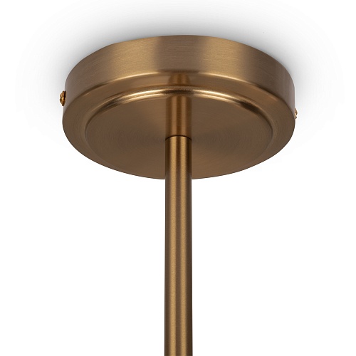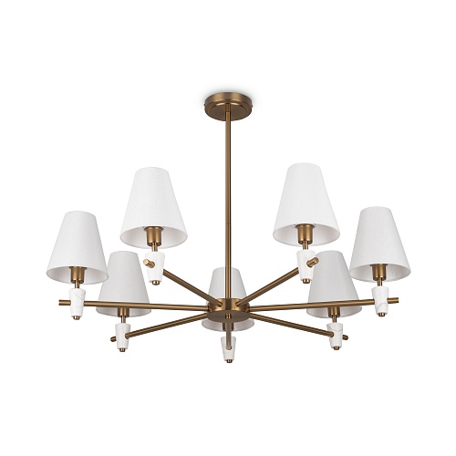 Металлическая арматура в цвете латунь. Дополнительные элементы — минималистичные вставки из натурального белого мрамора. Белые абажуры из ткани в форме конуса. Источник света — лампа с цоколем Е14 или Е27.