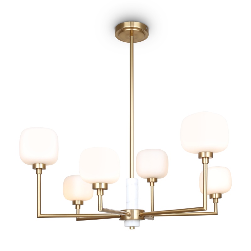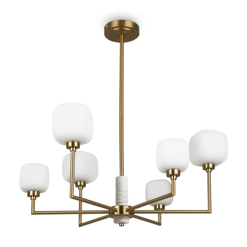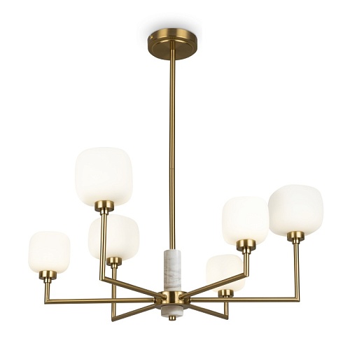 Металлическая графичная арматура цвета латунь. Плафоны из белого матового стекла в необычной форме округлых кубов - закреплены на разной по высоте комбинации. Мягкое равномерное освещение. Источником света служит лампа с цоколем G9.