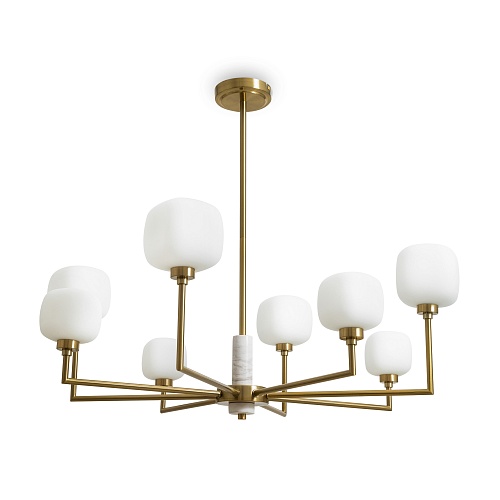 Металлическая графичная арматура цвета латунь. Плафоны из белого матового стекла в необычной форме округлых кубов - закреплены на разной по высоте комбинации. Мягкое равномерное освещение. Источником света служит лампа с цоколем G9.