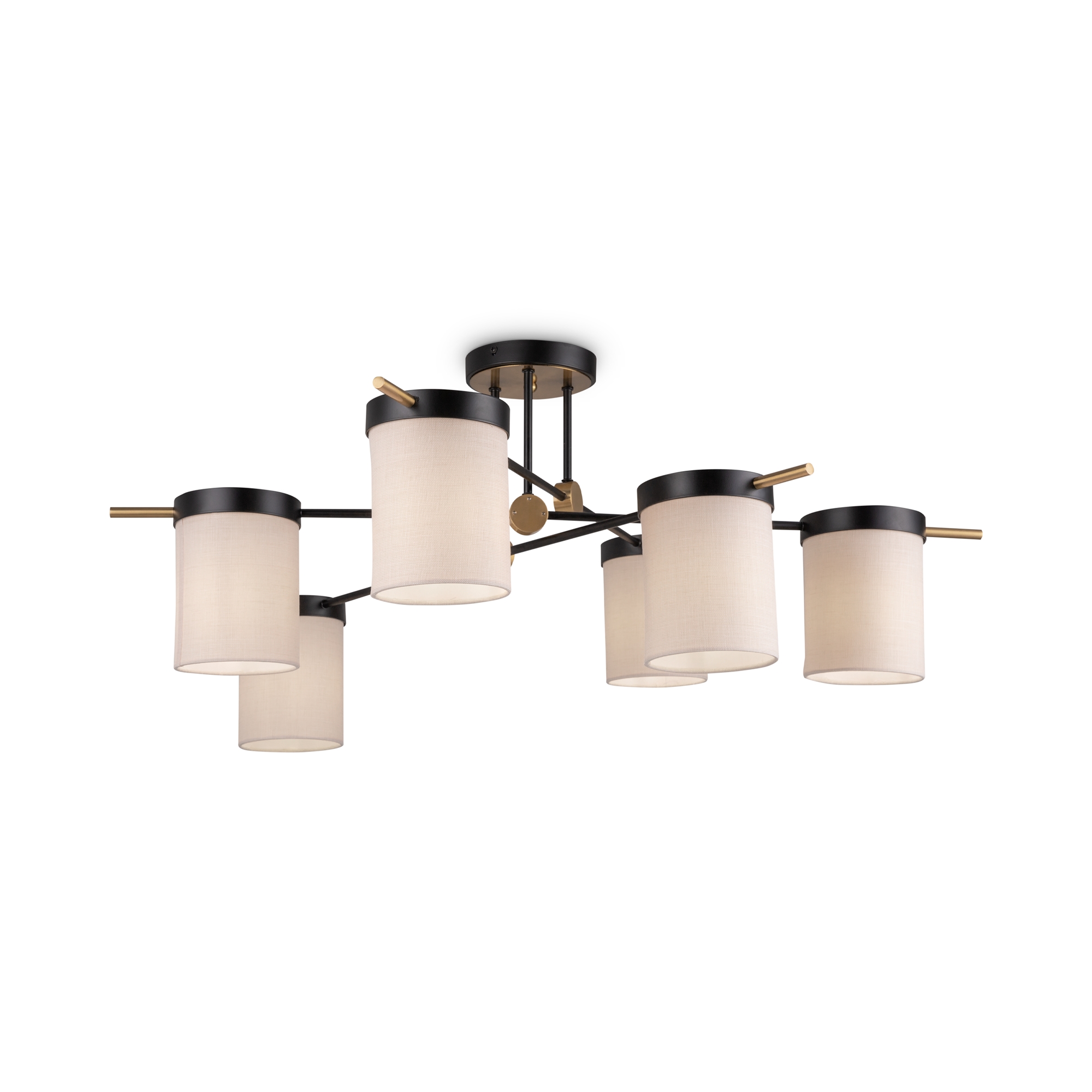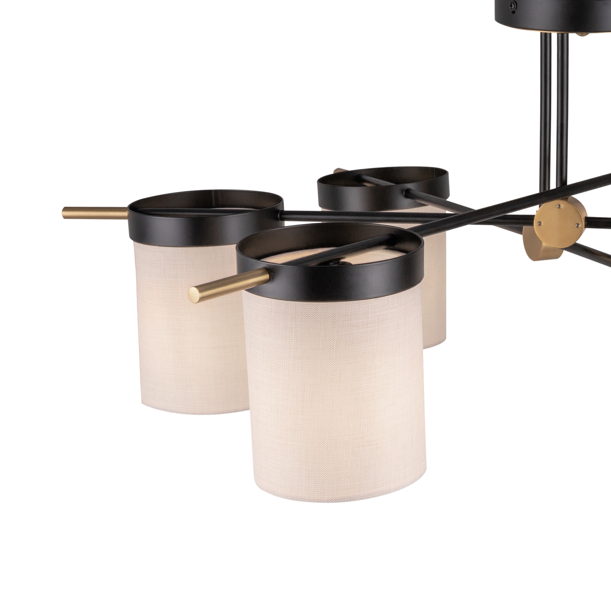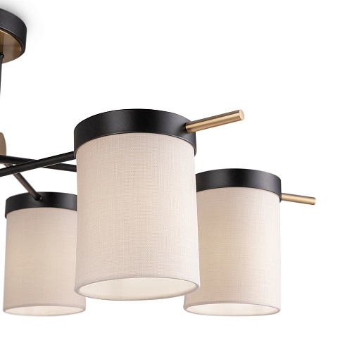 Арматура из металла. Основной цвет — чёрный, декоративные элементы в цвете латунь. Тканевые бежевые абажуры-цилиндры украшены чёрными металлическими основаниями. Компактные размеры для невысоких потолков. Источник света — лампа с цоколем Е14.