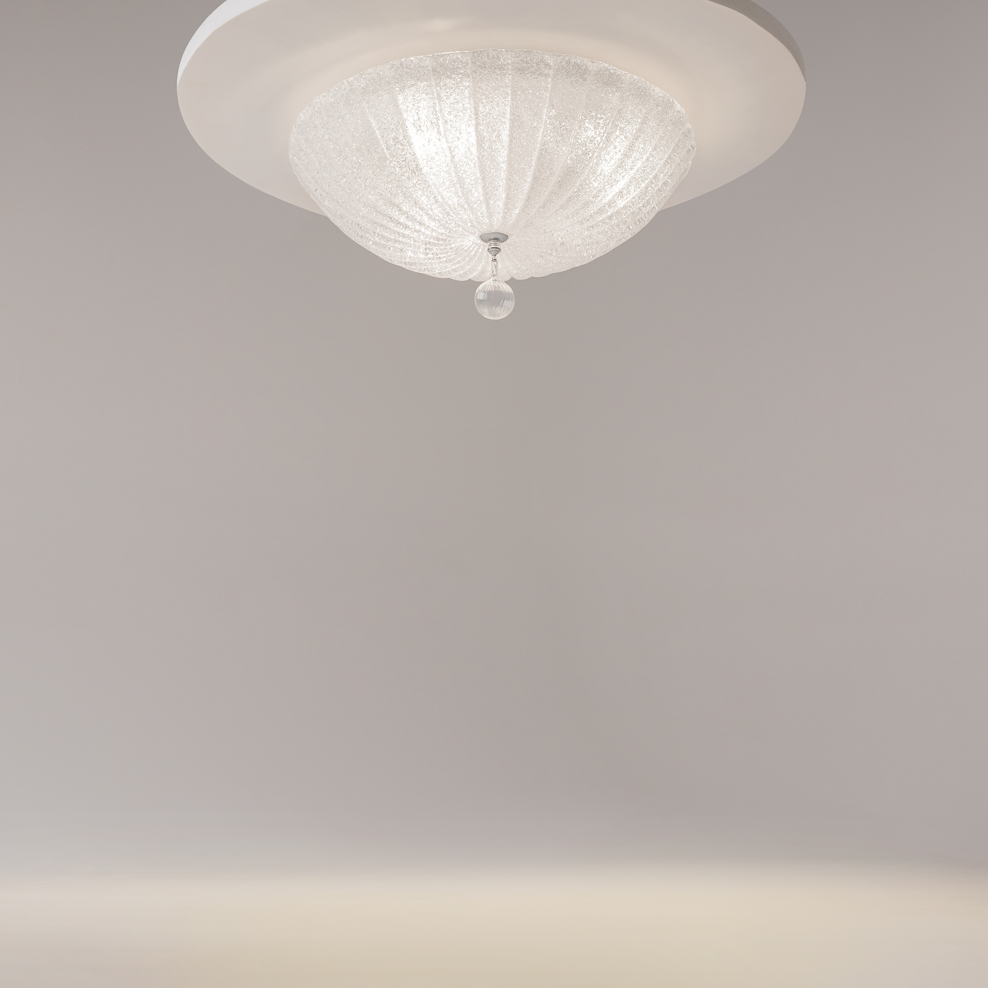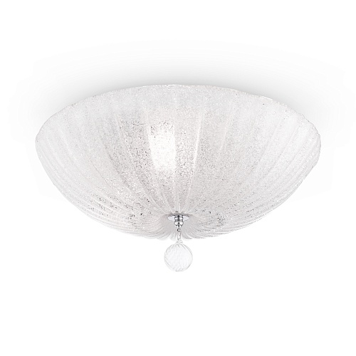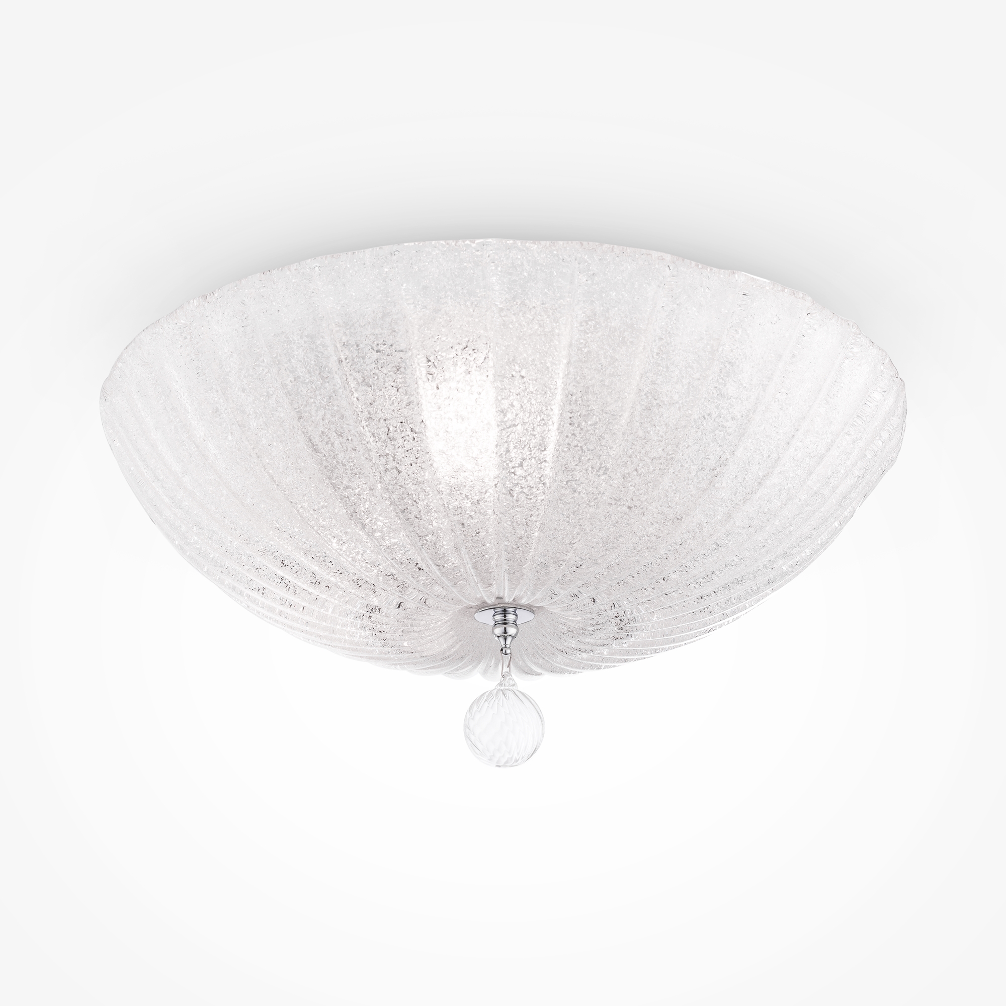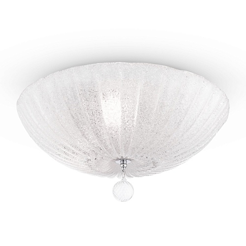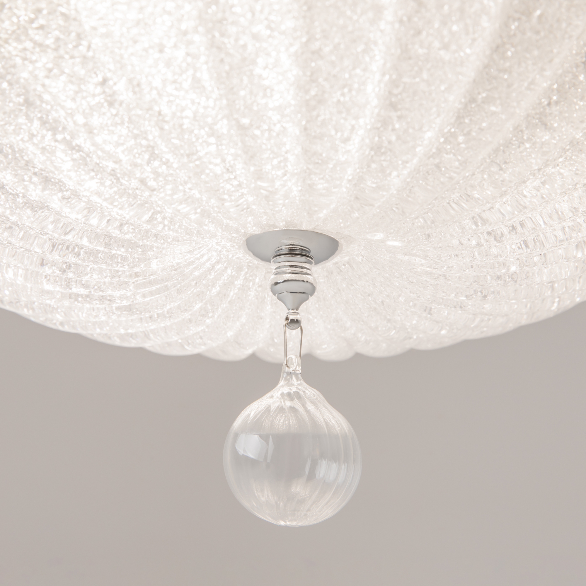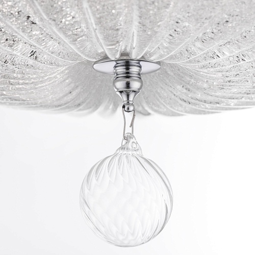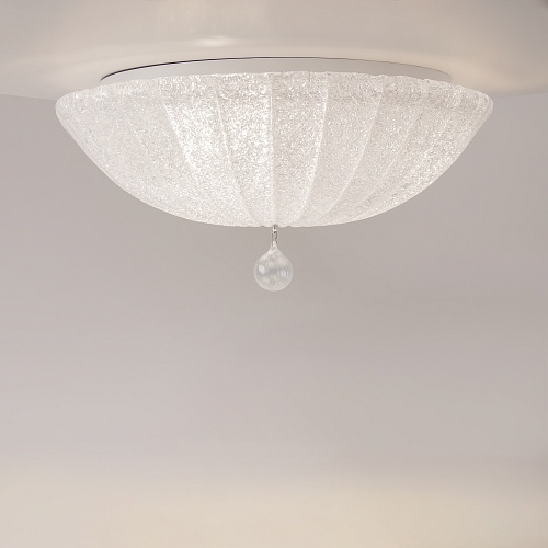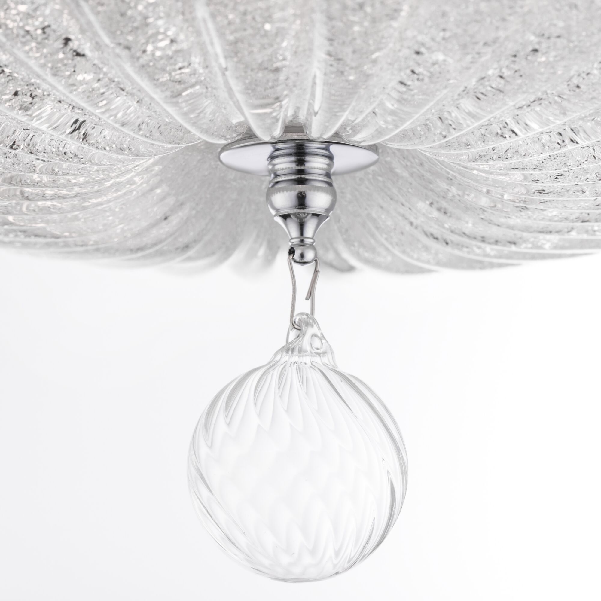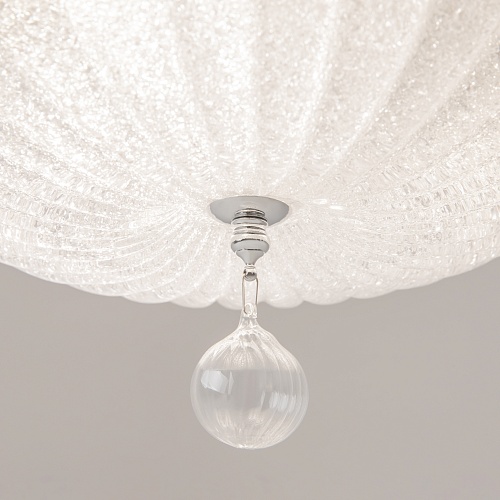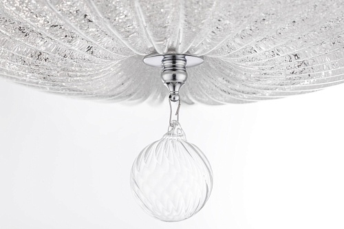 Арматура – металл, цвет – хром. Плафон – прессованное стекло, декор – стеклянная крошка. Подвеска – выдувное рельефное стекло.