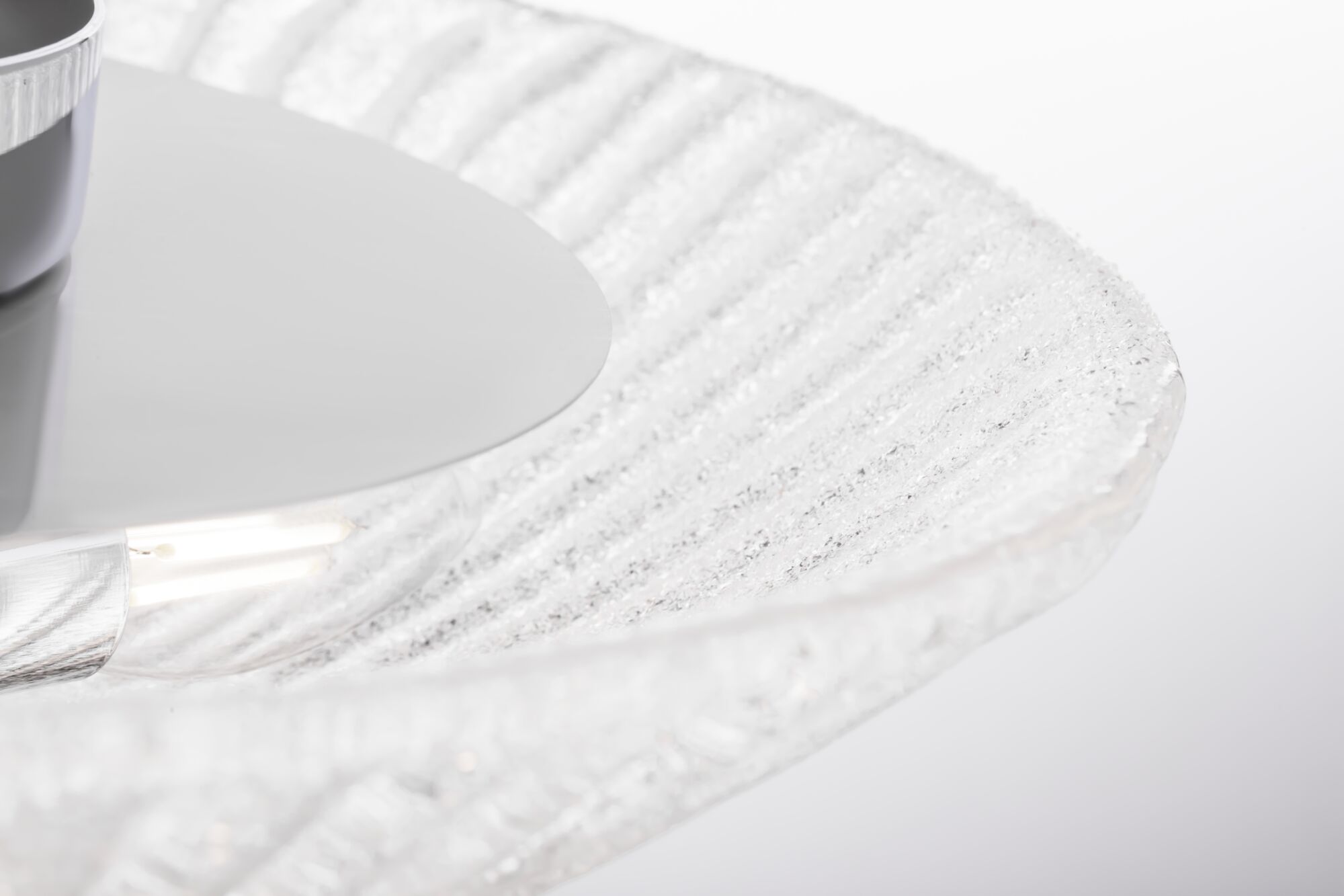 Материал арматуры – металл, цвет – хром. Материал плафона – прессованное стекло, эффект «заморозки». Фигурный наконечник из прозрачного стекла.