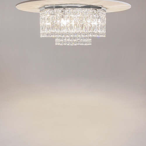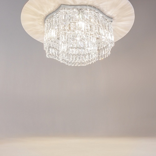 Металлическая арматура в двух оттенках: хром, золото. Декор – прозрачные кристаллы. Потолочные модели имеют два яруса подвесок. Высота подвесной люстры регулируется тросом.