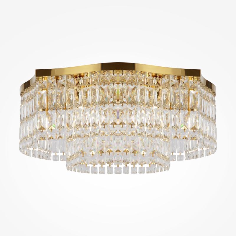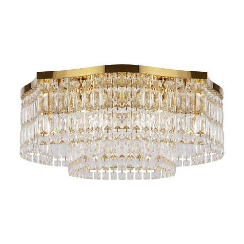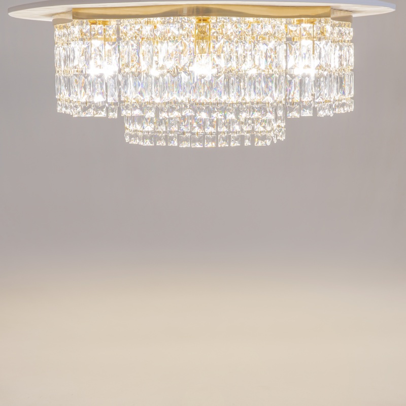 Металлическая арматура в двух оттенках: хром, золото. Декор – прозрачные кристаллы. Потолочные модели имеют два яруса подвесок. Высота подвесной люстры регулируется тросом.