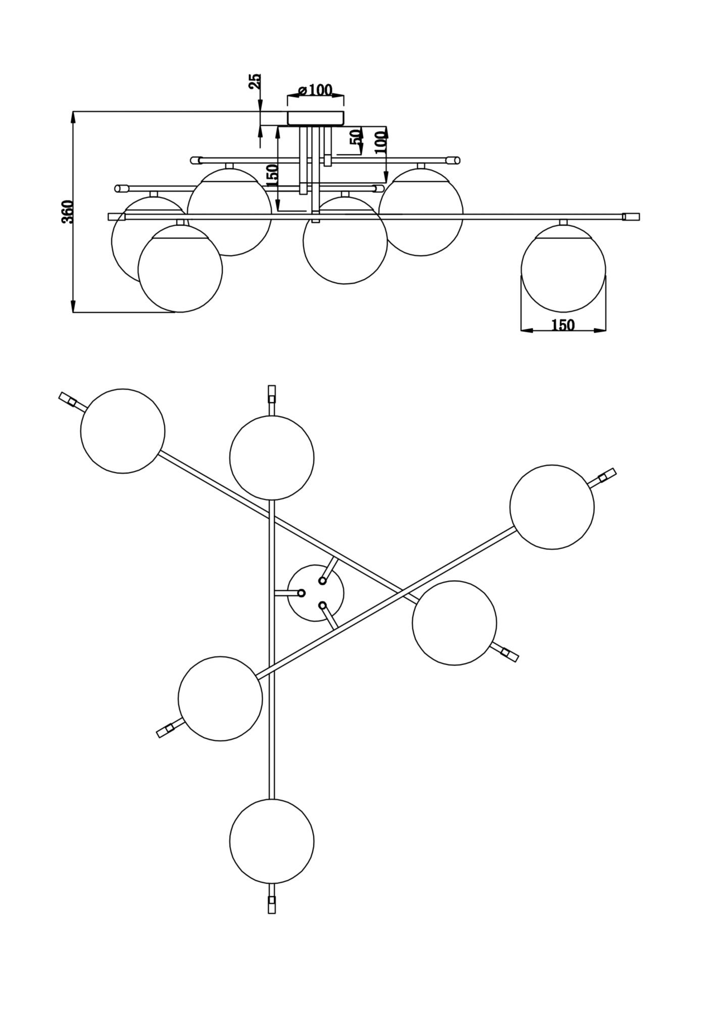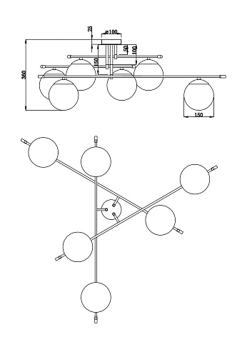 Арматура из металла в цвете матового золота. Плафоны-сферы из матового выдувного стекла. Модная асимметрия в дизайне. Источник света — лампы с цоколем Е14.