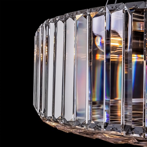 Металлическая арматура, цвет – хром. Декор – прямоугольные хрустальные пла стины. Источники света скрыты под фактурным стеклом. Высота светильников регулируется тросом.
