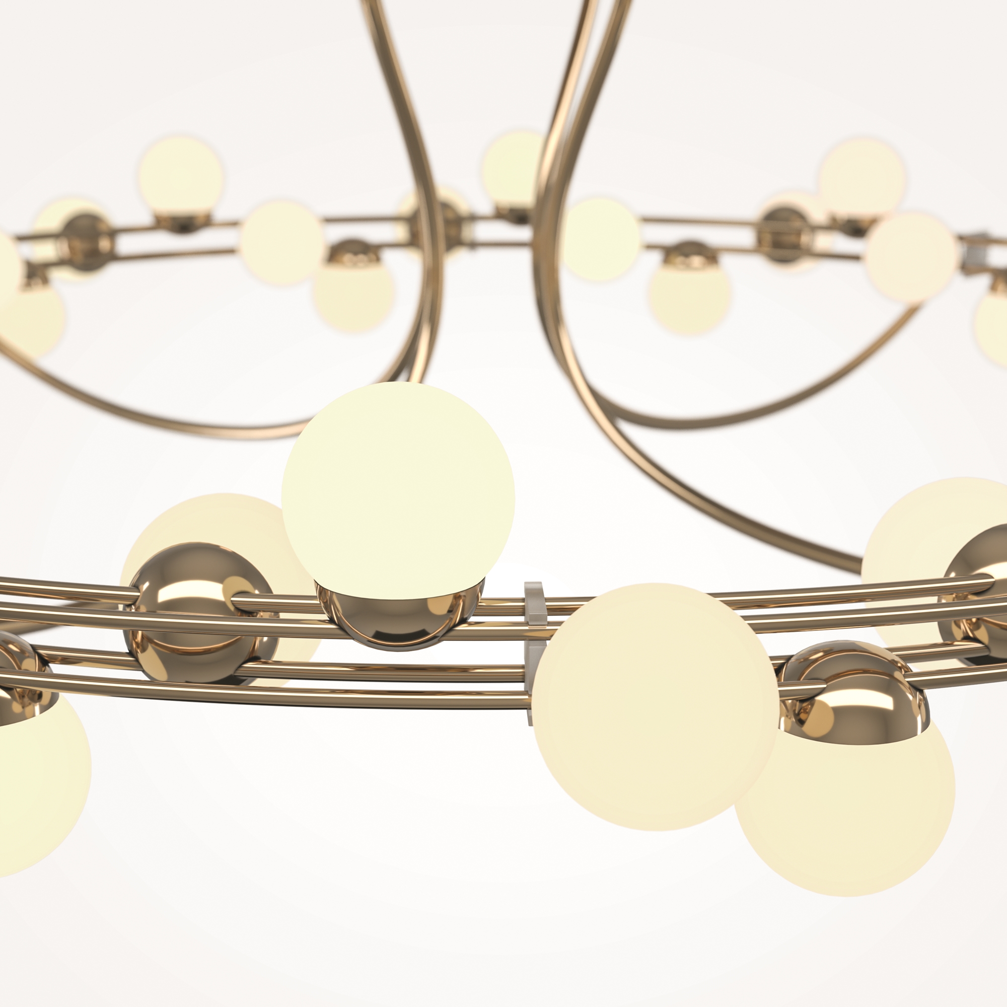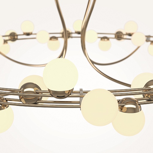 Арматура из металла в золотом цвете. Плафоны-сферы — белый пластик. Дизайн с имитацией молекулярной структуры. LED-источники света.