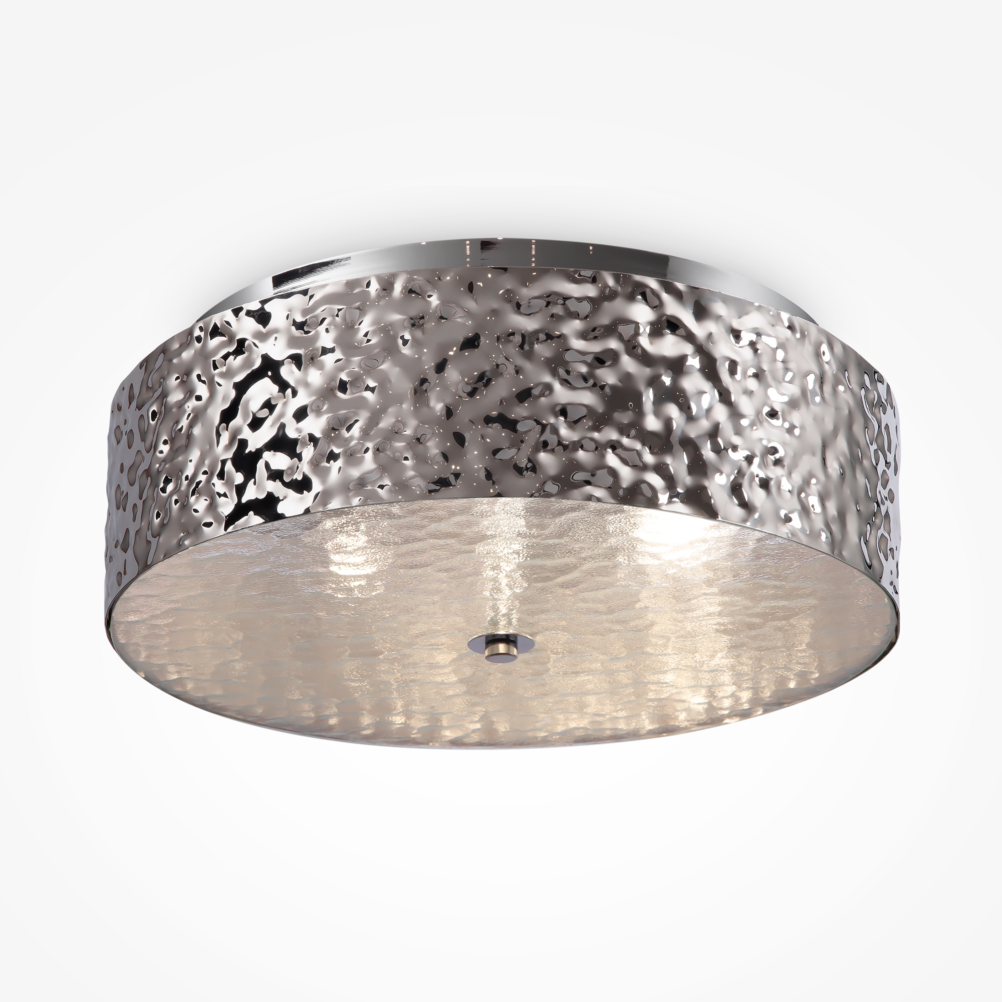 Арматура – металл в цветах хром и золото. Фактурный рисунок нанесен посредством чеканки. Стекло с рельефной поверхностью скрывает источники света. Декора тивный эффект «рябь на воде». Источник света - лампа с цоколем Е14.