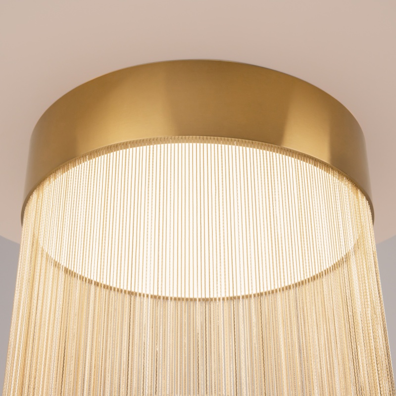 Металлическая арматура, цвет - золото. Мотивы ювелирного искусства в дизайне. Изящные цепочки на корпусе светильника создают переливы бликов. LED источник света. Цветовая температура - 3000К. Регулируемая высота подвесного светильника.