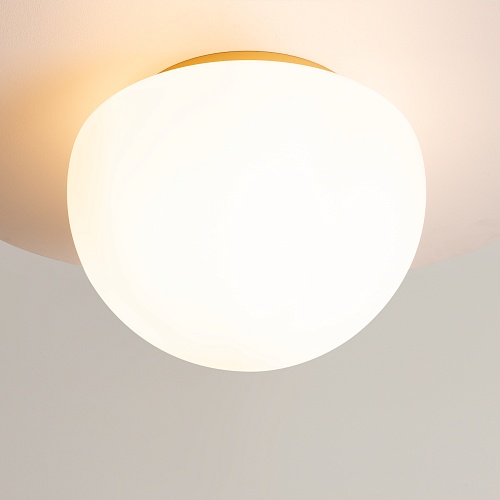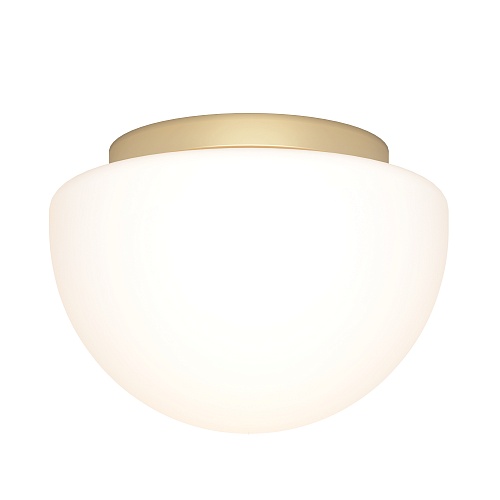 Металлическое основание, цвет - черный, золотой. Плафон-полусфера из стекла в двух цветах: глянцевый дымчато-черный, белый матовый. Компактная высота - подходит для помещений с невысокими потолками. Источник света - лампа с цоколем Е27.