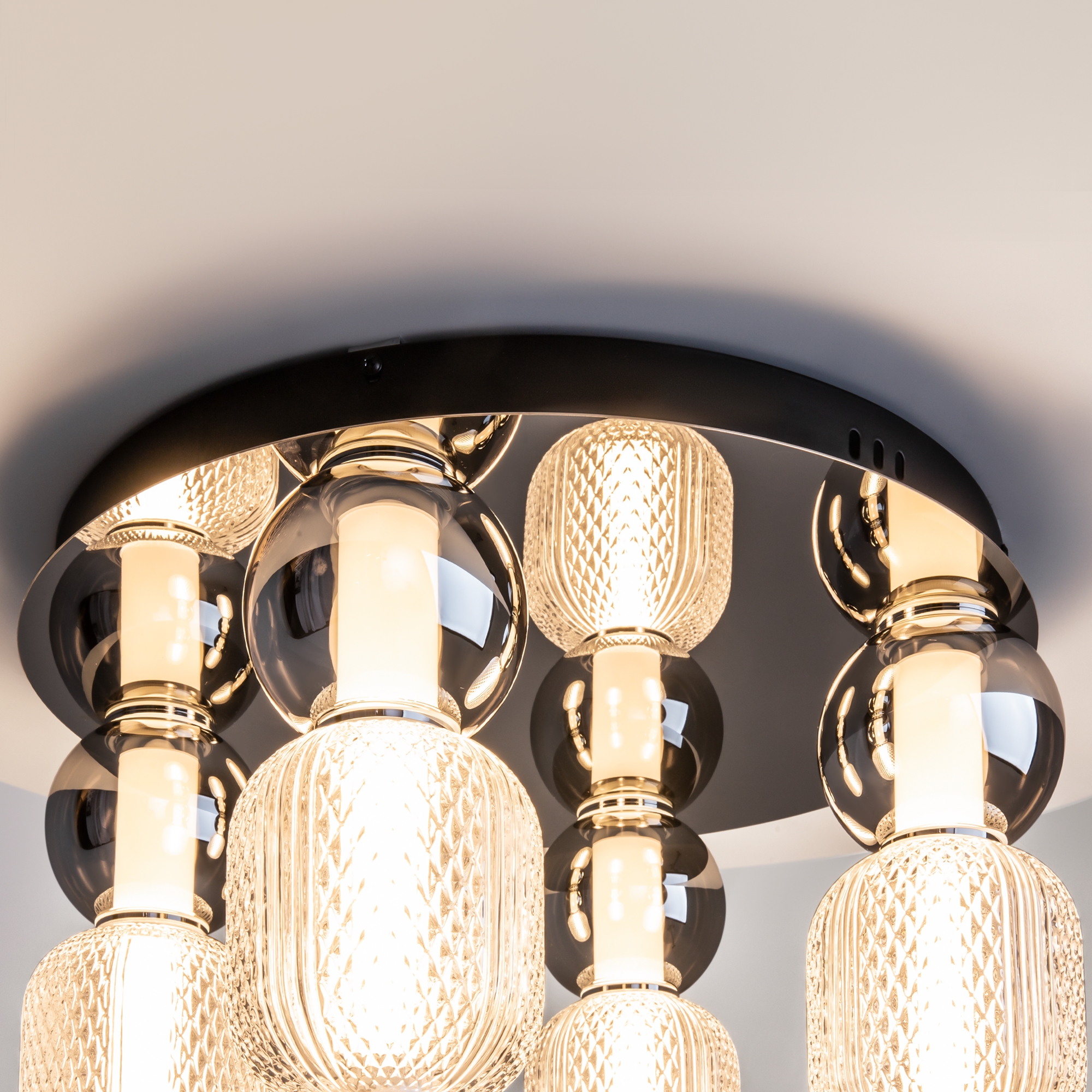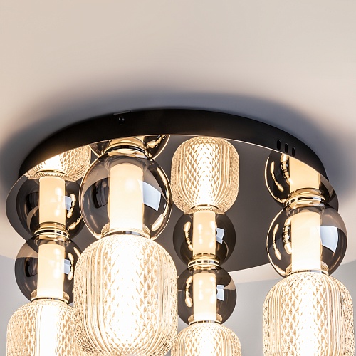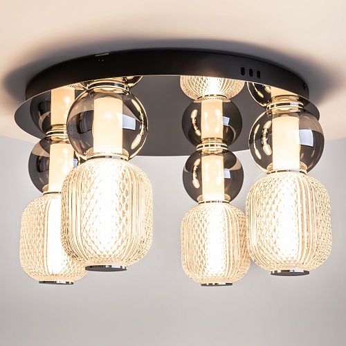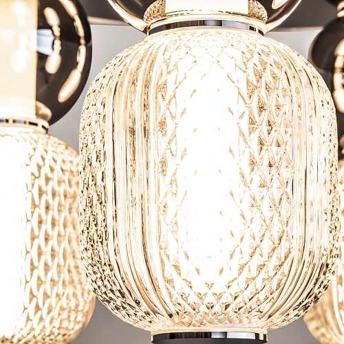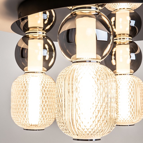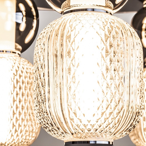 Материал арматуры - металл, цвета - золото, хром. Микс плафонов: гладкие cферы коньячного или дымчатого оттенка + округлые рельефные с ромбовидным узором из прозрачного стекла. Регулируемая высота подвесных моделей - максимальная длина провода 3 метра. LED-источник света, цветовая температура 3000К