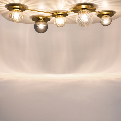 Компактное металлическое основание и арматура цвета латуни. Две модели с плафонами белого цвета и две с разноцветными плафонами: серый, прозрачный, дымчатый и оттенка коньяка. Источник света: цоколь Е14. Компактное основание светильника прилегает к потолку. Функциональное основное освещение. Местоположение разноцветных плафонов можно менять, создавая композиции по своему вкусу. Поверхность плафонов имеет орнамент, при включении светильника на потолке создаются узоры.
