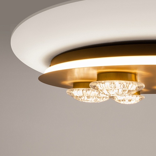 Арматура из металла цвета латунь с сатинированным финишным покрытием сочетается с прозрачными плафонами. Подвесные одинарные, горизонтальный и каскадные светильники оснащаются LED-модулем с двумя плоскими плафонами из акрила со сложным, актуальным паттерном на поверхности. Цветовая температура — 3000К, угол рассеивания — 125 градусов.