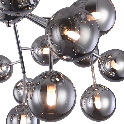Металлическая арматура в четырех цветах: матовый черный, хром, золото, латунь. Плафоны — выдувное стекло. Цвета — дымчатый, янтарный, коньячный. Дизайн с имитацией молекулярной структуры. Высота подвесных светильников регулируется тросом. Лампа с цоколем G9.