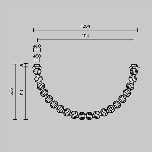 Арматура из металла, цвет – хром. Акцентный декор в виде рельефных сфер из литого стекла. Источник света – светодиодная лента – скрыта под акриловым рассеивателем. Регулируемая высота подвесных светильников.