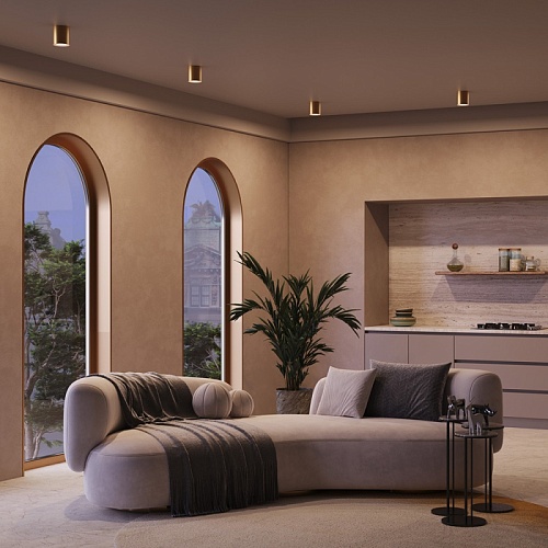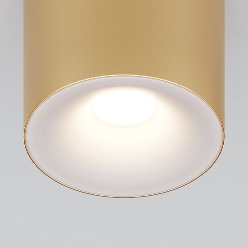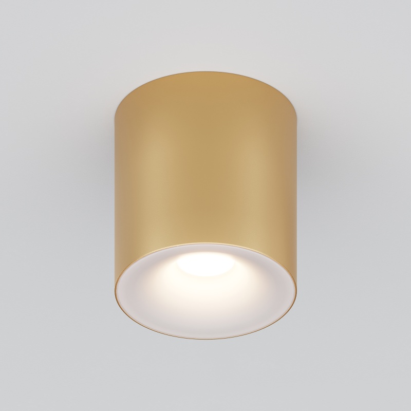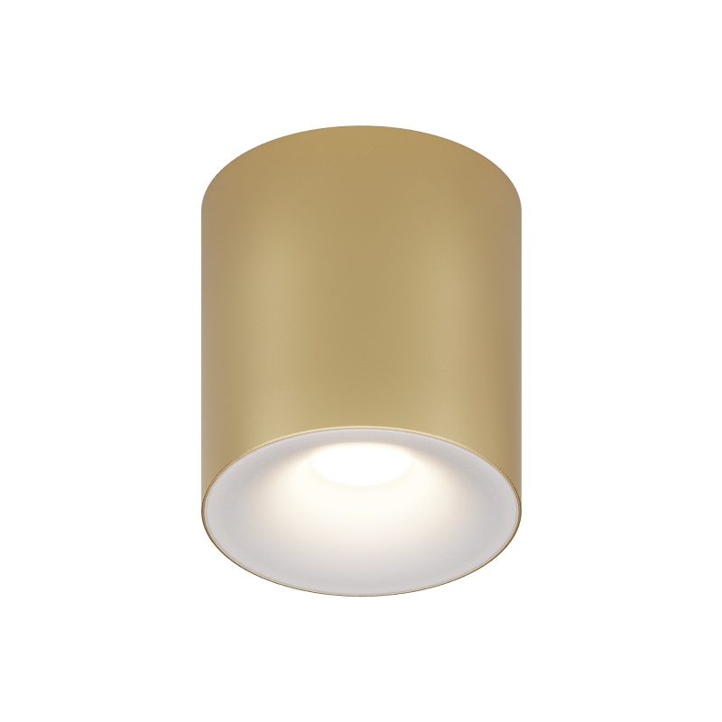 Материал корпуса – металл; цвет – белый, чёрный и золотой. Форма корпуса – стаканчик. Акриловый рассеиватель. Сияющий эффект при свечении. Отсутствие стопорного кольца. Утопленный источник света – лампа GU10.