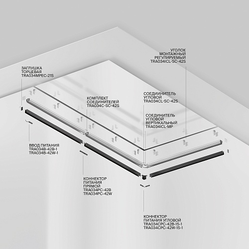 Комплектующие для низковольтной магнитной трековой системы Exility в черном и белом цветах. Разнообразие аксессуаров позволяет собрать свою уникальную конструкцию для накладного монтажа, подвесного, встраиваемого под гипсокартон и встраиваемого в натяжные потолки.