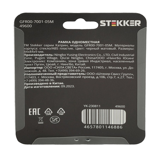 Характеристики Рамка 1-местная, стекло, STEKKER GFR00-7001-05М, серия Катрин, черный матовый