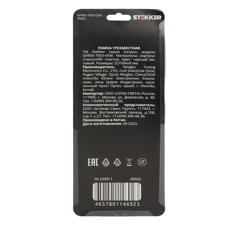 Характеристики Рамка 3-местная, стекло, STEKKER GFR00-7003-05М, серия Катрин, черный матовый