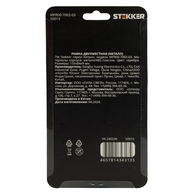 Характеристики Рамка 2-местная, металл, STEKKER, MFR00-7002-03 , серия Катрин, серебро