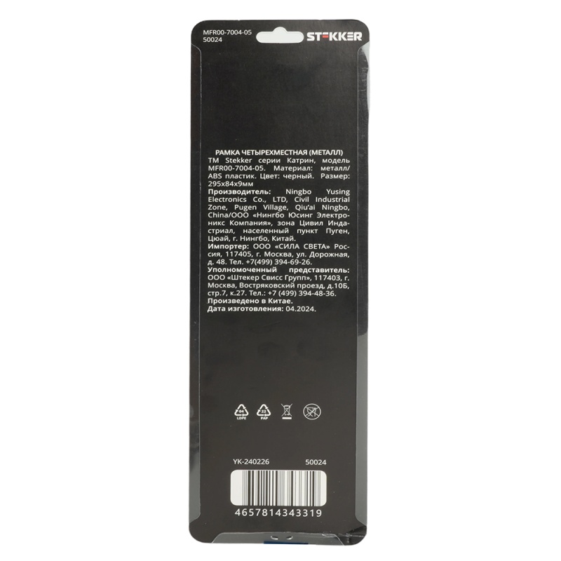 Характеристики Рамка 4-местная, металл, STEKKER MFR00-7004-05, серия Катрин, черный