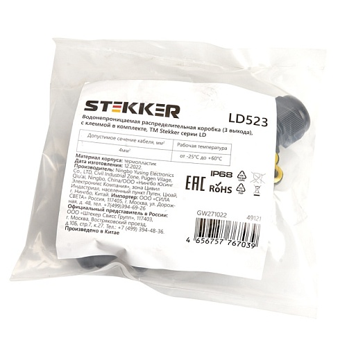Характеристики Коробка распределительная STEKKER LD523 водонепроницаемая на 3 выхода, 450V, 140х78х36, черный