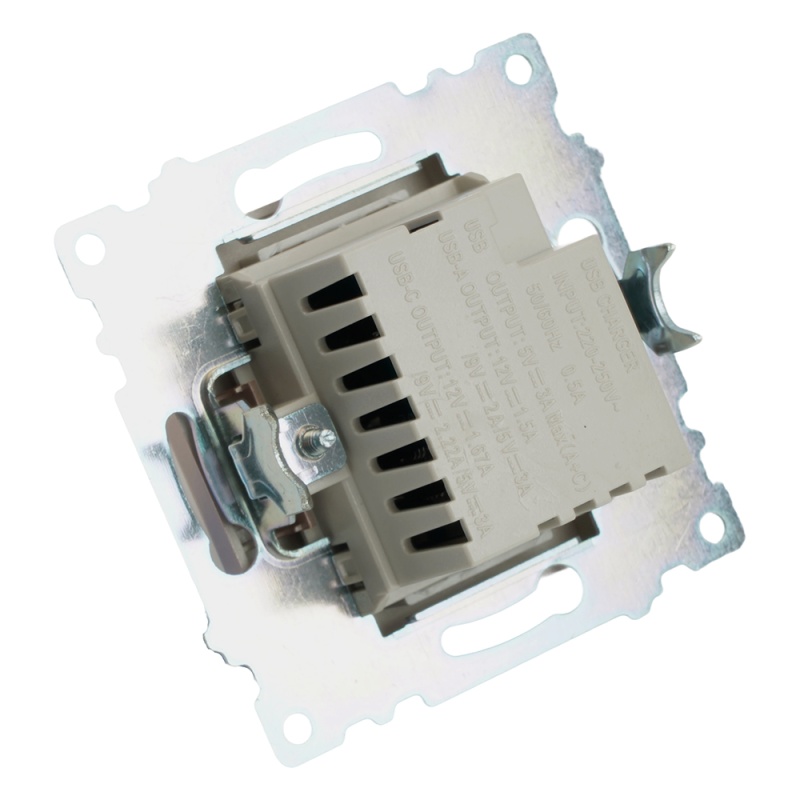 Характеристики Розетка 2-местная USB + type C (механизм), STEKKER GLS10-7116-02, 250B, 3A, max 20W, серия Катрин, шампань