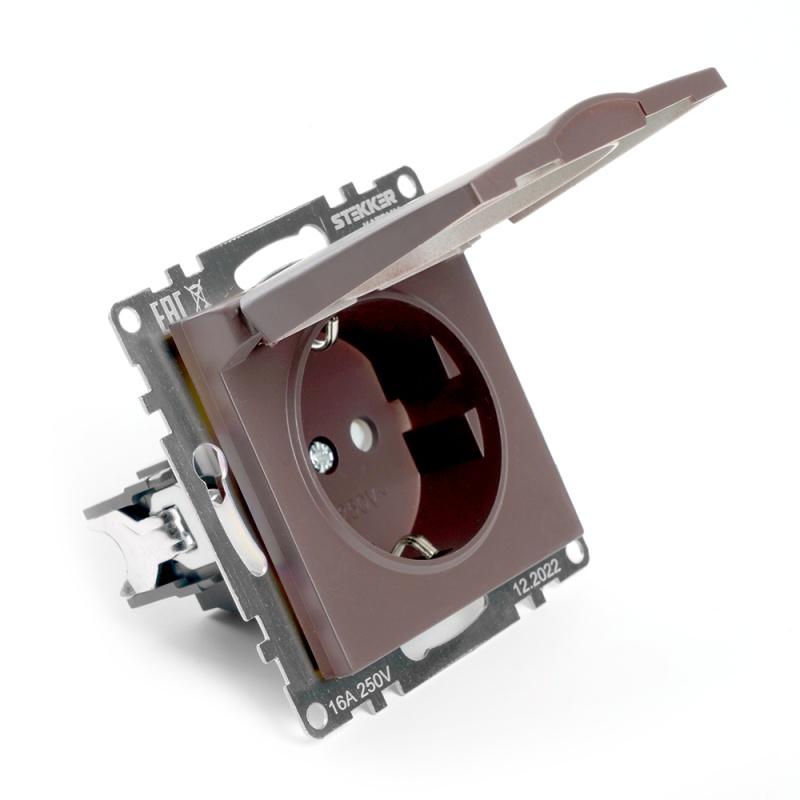 Характеристики Розетка 1-местная с/з с крышкой (механизм), STEKKER GLS16-7112-04, 250В, 16А с защитной шторкой, серия Катрин, шоколад
