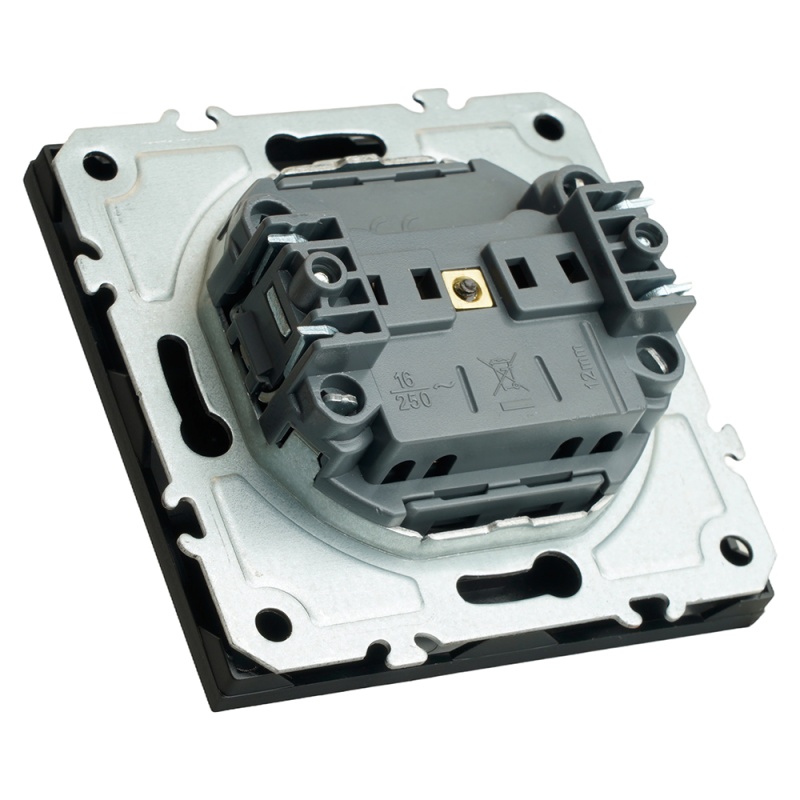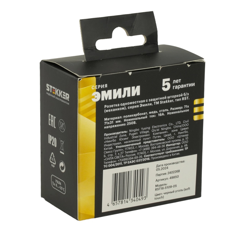 Характеристики Розетка 1-местная с защитной шторкой (механизм), STEKKER, б/з, 250В, 16А, серия Эмили, RST16-5109-05, черный уголь, soft touch