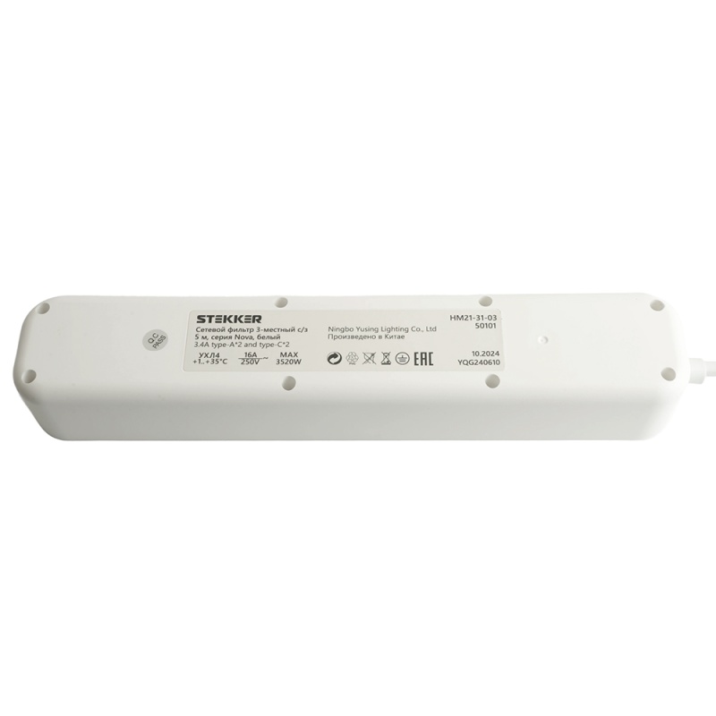 Характеристики Сетевой фильтр 3-местный с/з STEKKER 3x1мм2, 5 м, 250В, 16А, 2 USB-A+2 Type-C 3, серия Nova, белый