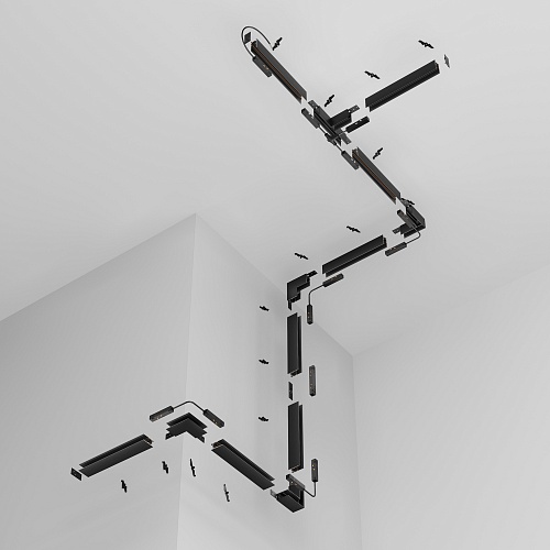 Комплектующие для низковольтной магнитной трековой системы Exility в черном и белом цветах. Разнообразие аксессуаров позволяет собрать свою уникальную конструкцию для накладного монтажа, подвесного, встраиваемого под гипсокартон и встраиваемого в натяжные потолки.