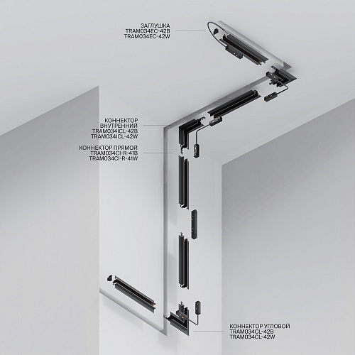 Комплектующие для низковольтной магнитной трековой системы Exility в черном и белом цветах. Разнообразие аксессуаров позволяет собрать свою уникальную конструкцию для накладного монтажа, подвесного, встраиваемого под гипсокартон и встраиваемого в натяжные потолки.