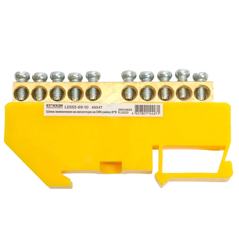 Шина"PE" на изоляторе STEKKER 6*9 на DIN-рейку 10 выводов, желтый, LD555-69-10 49547