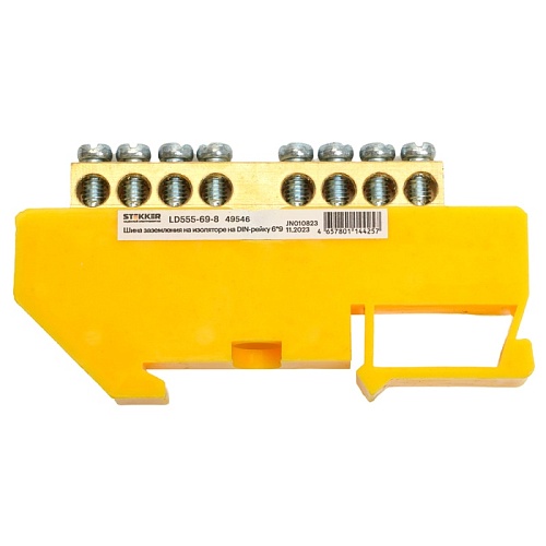 Шина"PE" на изоляторе STEKKER 6*9 на DIN-рейку 8 выводов, желтый, LD555-69-8