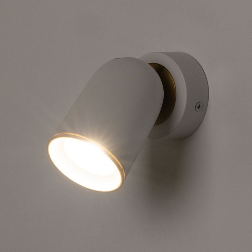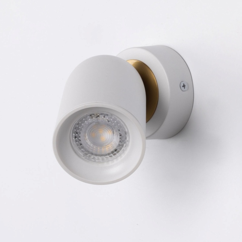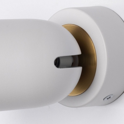 Металлическое основание настенного бра окрашено в белый цвет. Основание декорировано металлическим элементом круглой формы, гальванизированным в цвет латуни. Корпус плафона выполнен из сплава алюминия с цинком и окрашен в цвет основания.