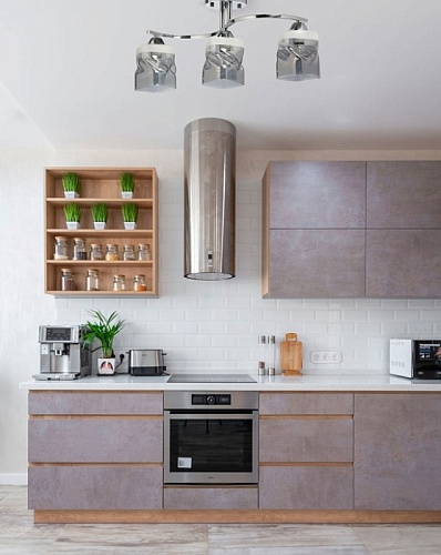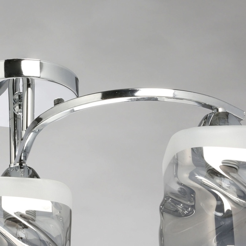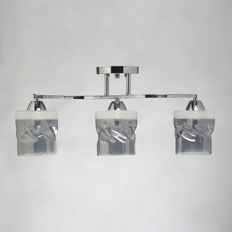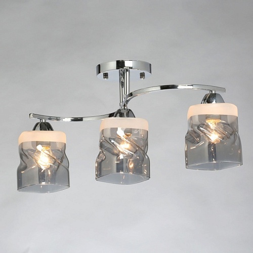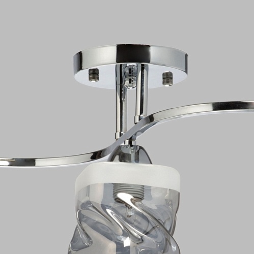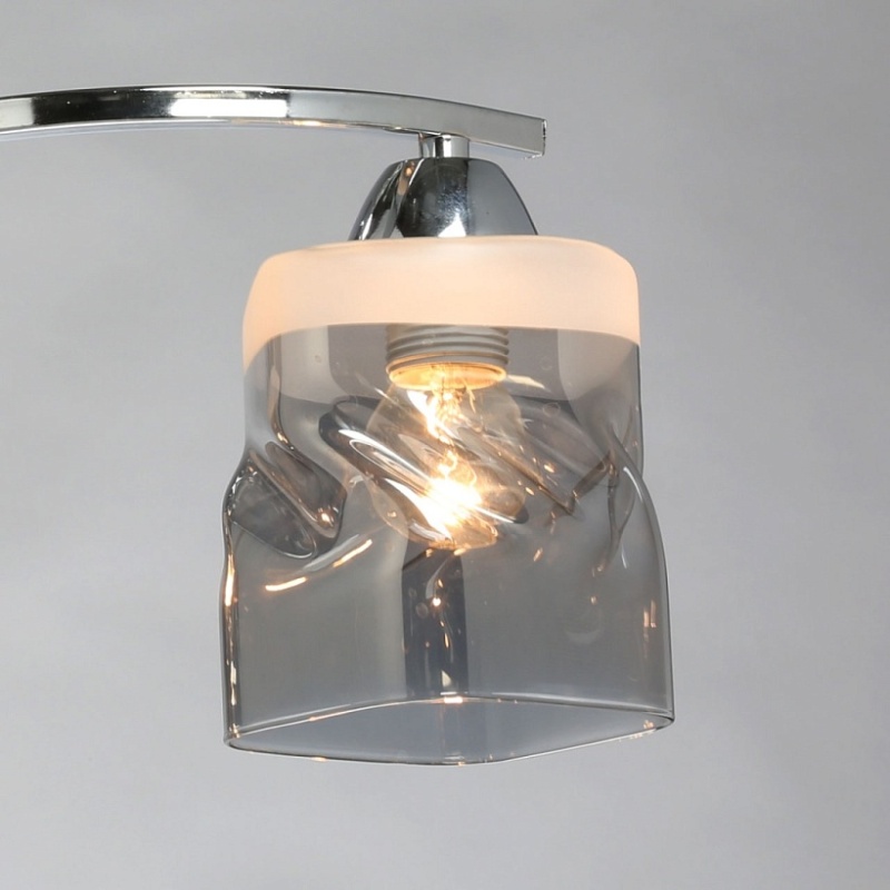 Металлическое основание светильника гальванизировано в цвет хрома. Стеклянные плафоны отлиты в сложную перекрученную форму и гальванизированы в дымчатый цвет. У основания плафоны окрашены в белый цвет.