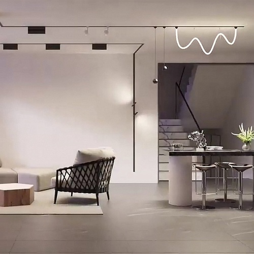 подвесной светильник на шинопровод белого цвета с закругленным конусообразным плафоном, в который встроено декоративное акриловое кольцо.