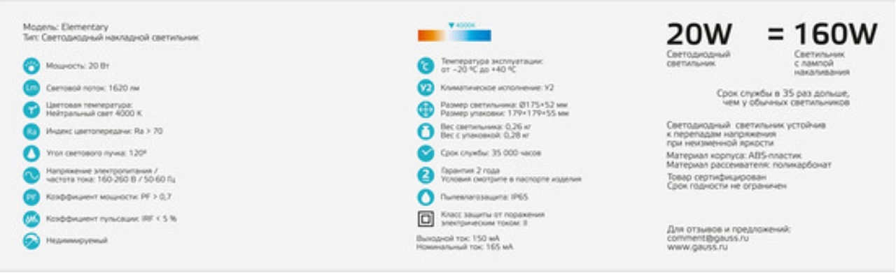 Характеристики Светильник GAUSS 126411220_GAUSS