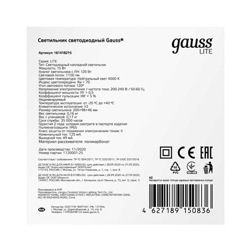 Характеристики Светильник GAUSS 161418215_GAUSS