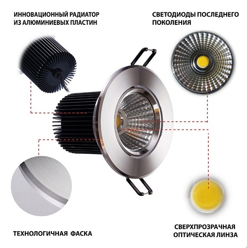 Арматура светильника выполнена из сплава алюминия, отполирована и покрыта прозрачным защитным лаком. По краю снята декоративная фаска. Светодиоды закрыты прозрачным стеклом. Клипсы с прорезиненным покрытием.