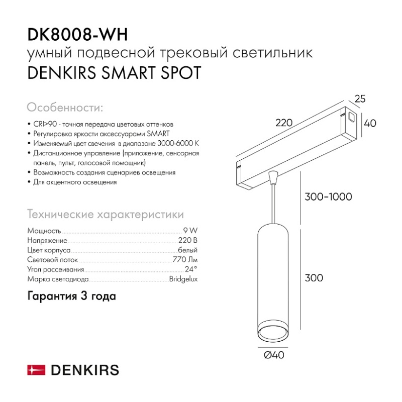 Умная система освещения DENKIRS SMART сочетает в себе минималистичный стиль, простоту установки и систему дистанционного управления освещением. Позволяет создавать разнообразные световые сценарии в интерьере и легко возвращаться к ним. Каждый светильник системы имеет возможность регулировки яркости и цветовой температуры, что позволяет подстраивать освещение под разные задачи: создать бодрую рабочую атмосферу, уютную вечернюю обстановку и многое другое. Возможно управление радиопультом, сенсорной панелью, а также через приложение или при помощи голосового помощника. Трековая система включает в себя алюминиевый профиль, шинопровод, светильники, комплектующие для шинопровода, а также устройства для управления системой. Серия умных трековых светильников для акцентного освещения. Имеют узкий угол излучения 24°. Оснащены светодиодами Bridgelux с высоким индексом цветопередачи CRI>90. Удобный и надежный монтаж в трек DENKIRS SMART с помощью механических защелок. Изменяемая яркость и цветовая температура 3000-6000K.