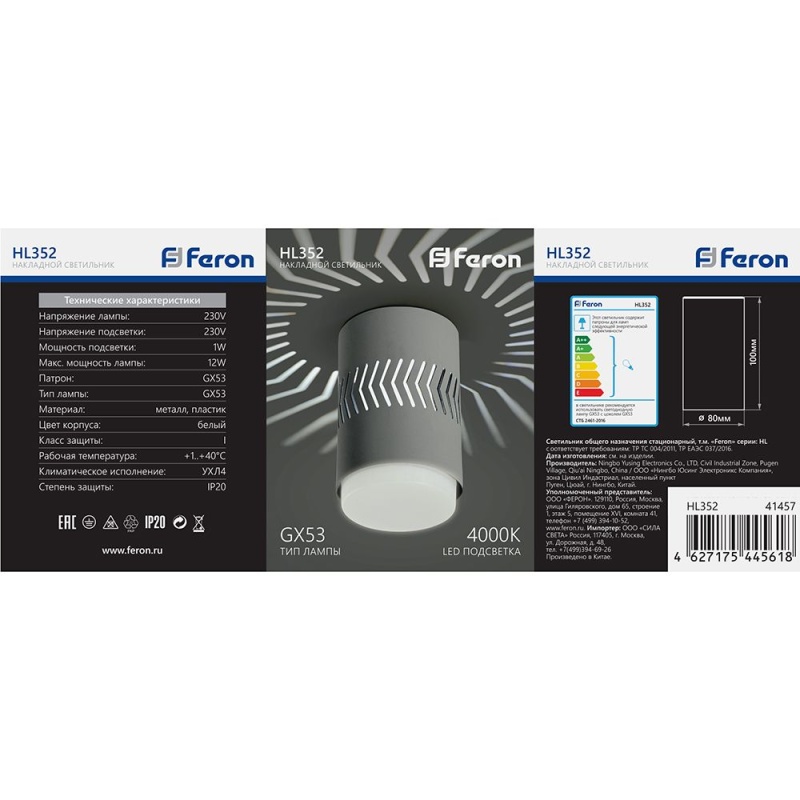 Характеристики Светильник потолочный Feron HL352 12W, 230V, GX53 и подсветка 1W, 4000K, белый