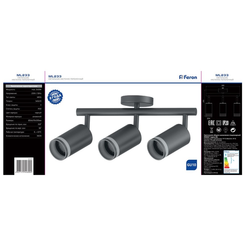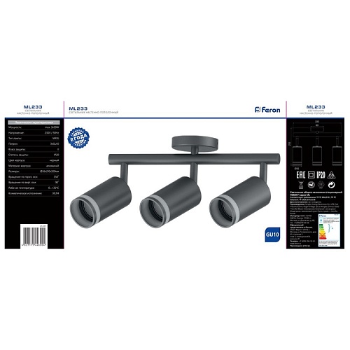 Характеристики Светильник Feron ML233 LUNA настенно-потолочный под лампу GU10, черный