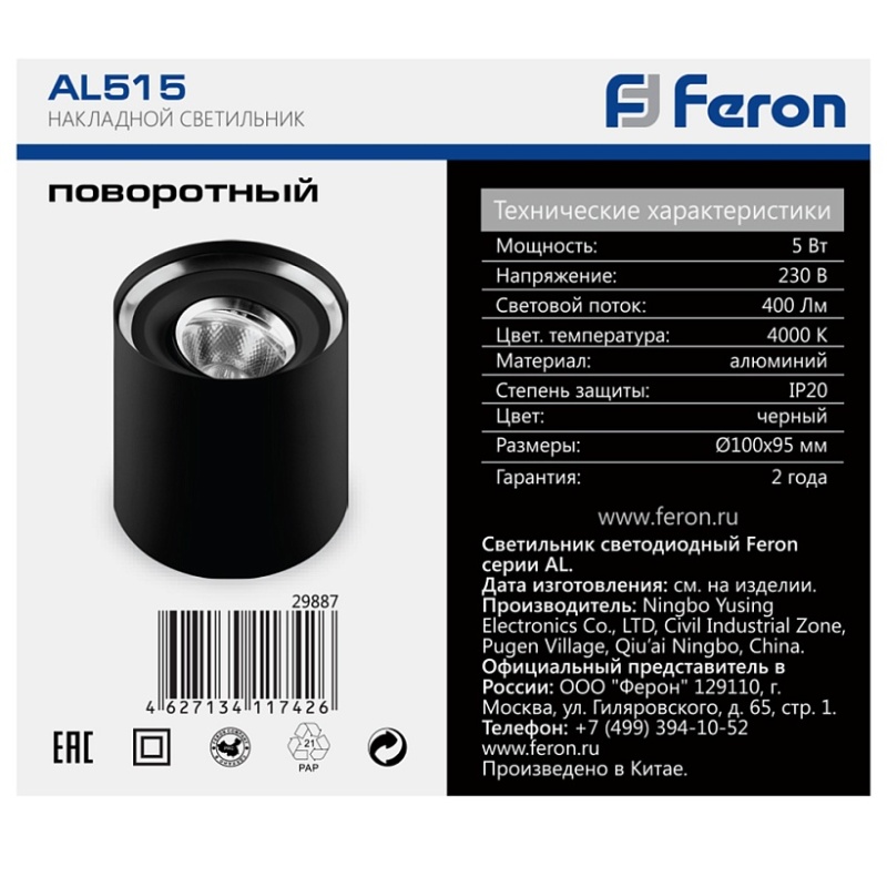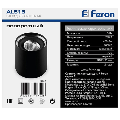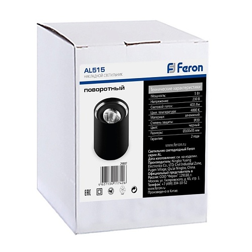 Характеристики Светильник накладной светодиодный для акцентного освещения FERON AL515 29887