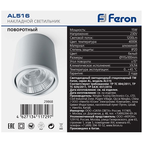 Характеристики Светодиодный светильник Feron AL516 накладной 15W 4000K белый поворотный