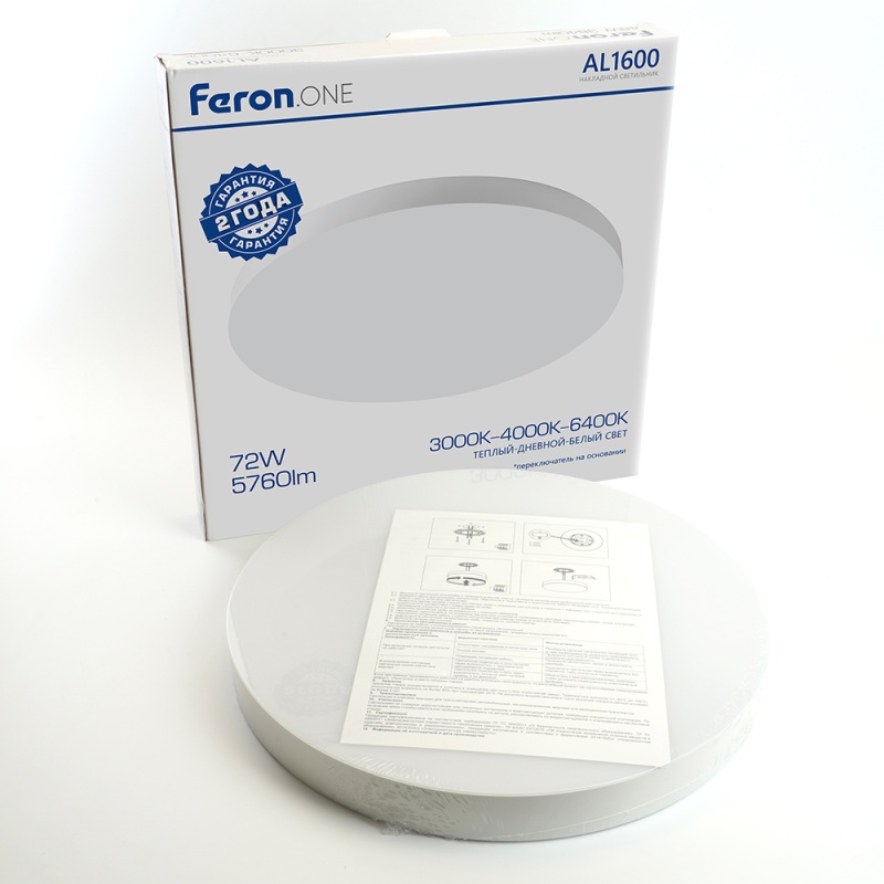 Отзывы о Светильник накладной со светодиодами 72W, 5760Lm, 3000К-4000К-6400K, AL1600 Feron.ONE