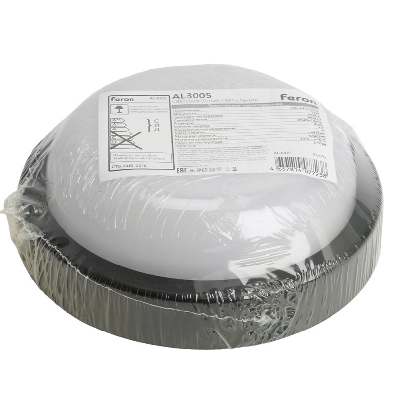 Характеристики Светильник светодиодный пылевлагозащищённый Feron AL3005 в пластиковом корпусе 12W 6500K 220V IP65 черный