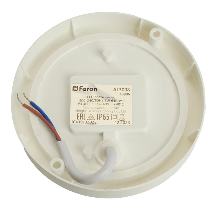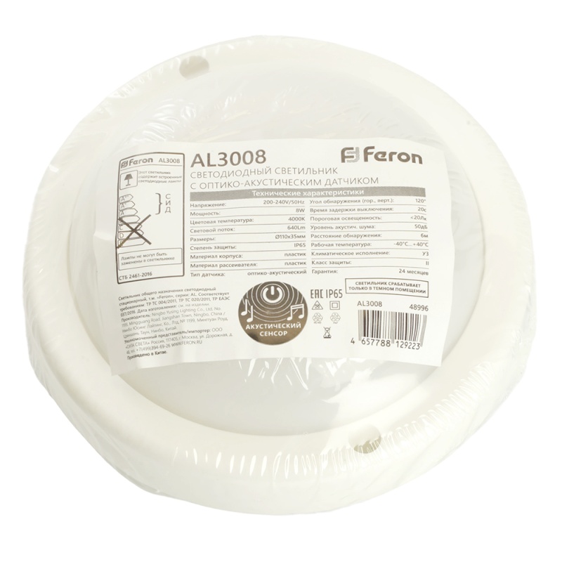 Характеристики Светильник светодиодный пылевлагозащищённый с оптико- акустическим датчиком Feron AL3008 в пластиковом корпусе 8W 4000K 220V IP65 белый