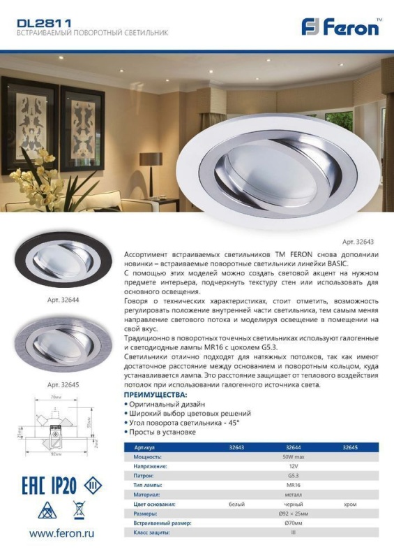 Отзывы о Светильник встраиваемый Feron DL2811 потолочный MR16 G5.3 черный-хром
